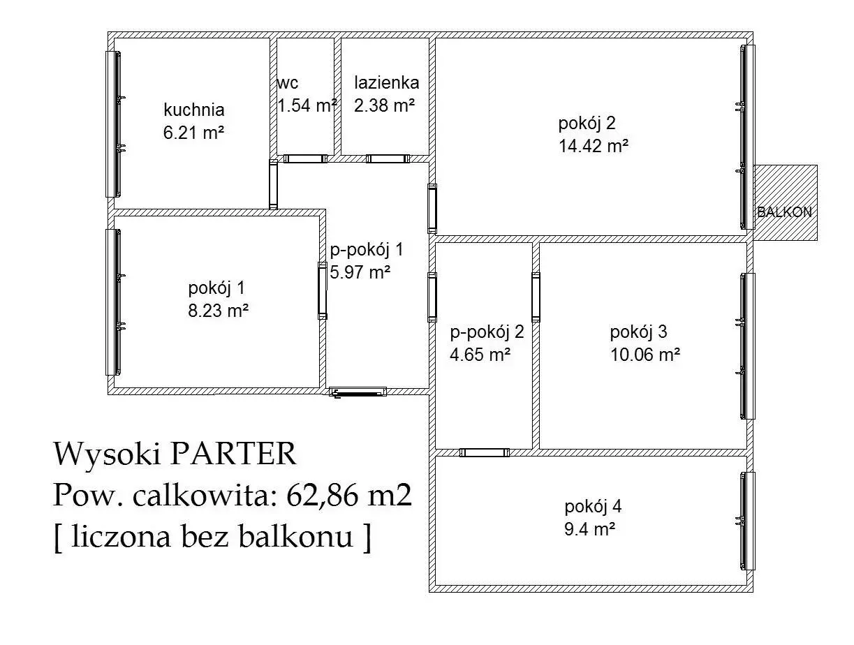 Sprzedam mieszkanie 4 pokojowe (62,86 m2) z balkonem w stanie przygotowanym do renowacji lub przebudowy.