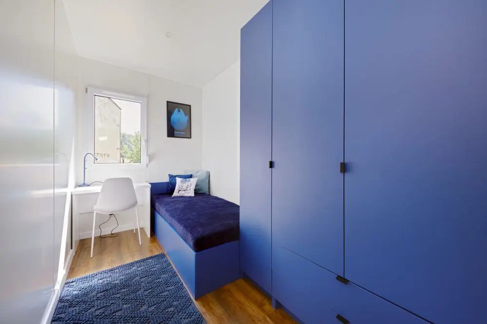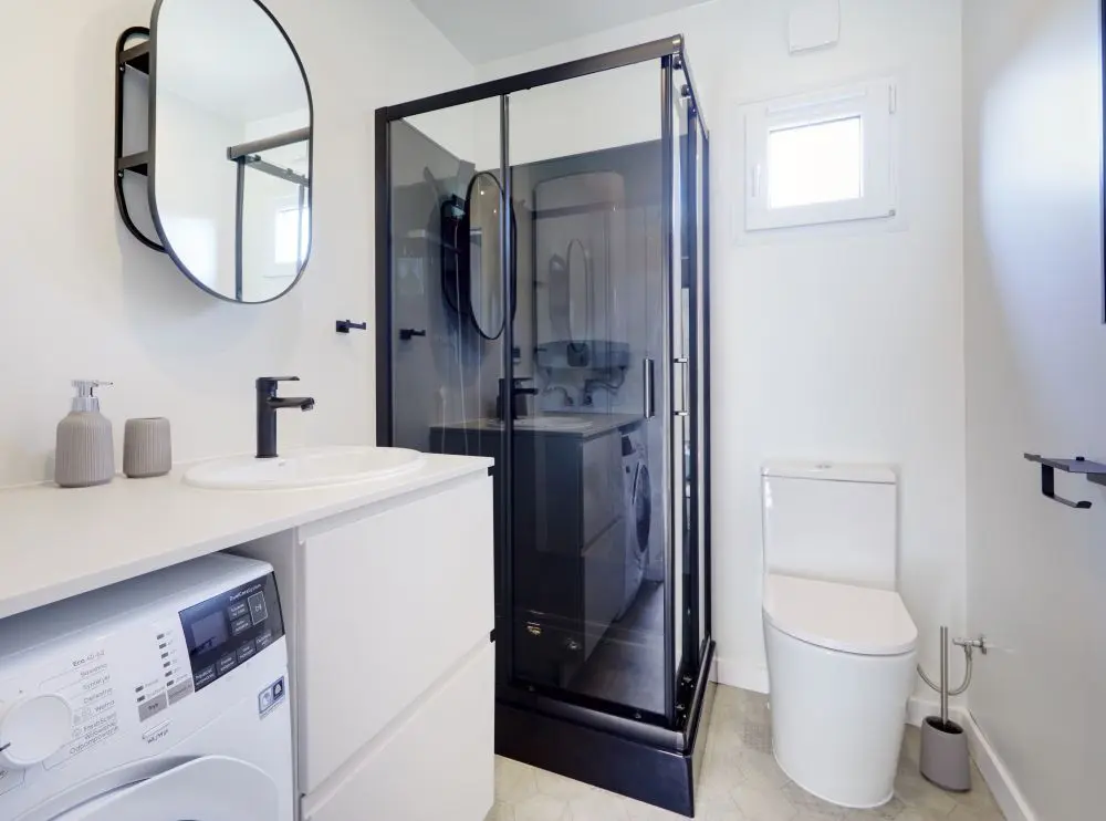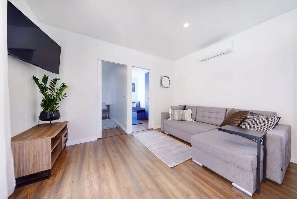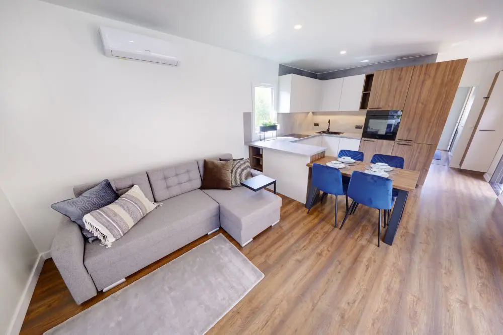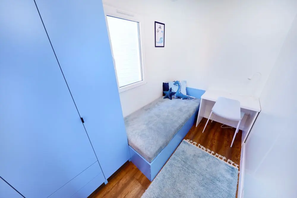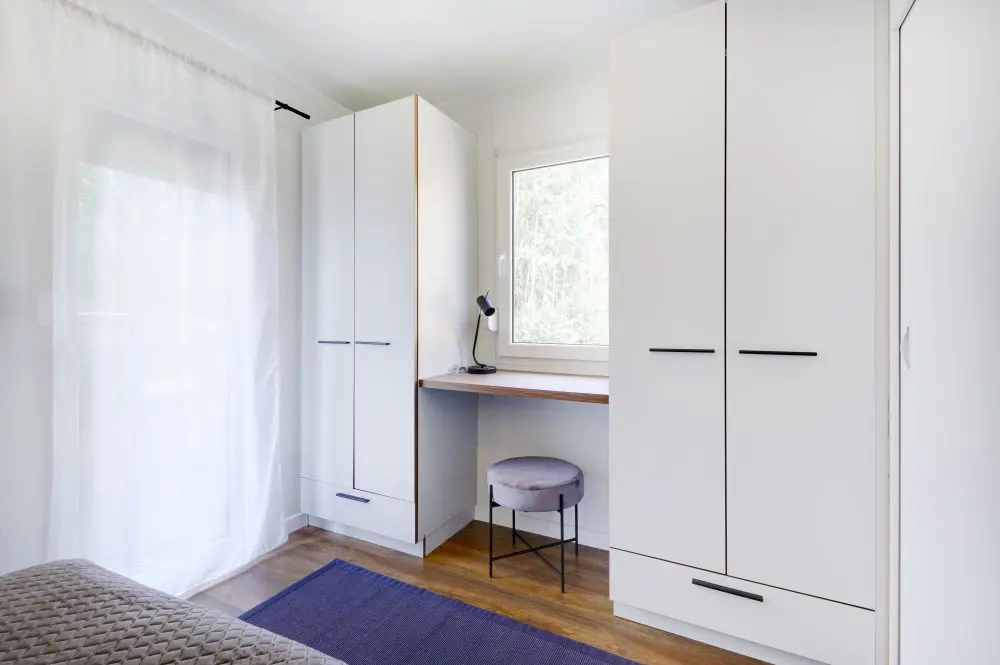 Domek ma 3 pokoje - sypialnię i 2 pokoje dla dzieci, łazienkę i salon z aneksem kuchennym. Kuchnia bardzo wysokiej jakości na osprzęcie BLUM wyposażona w zmywarkę, lodówkę, piekarnik, płytę elektryczną producentów renomowanych marek. W skład wyposażenia wchodzi również 42-calowy telewizor z funkcją smart i pralka.