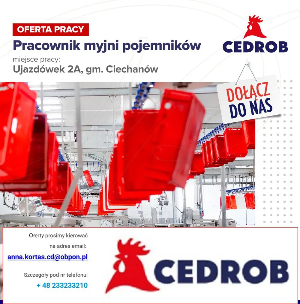 „Wyrażam zgodę na przetwarzanie moich danych osobowych przez CEDROB S.A. z siedzibą w Ujazdówku Ujazdówek 2a, 06-400 Ciechanów, w celu prowadzenia rekrutacji na aplikowane przeze mnie stanowisko”.