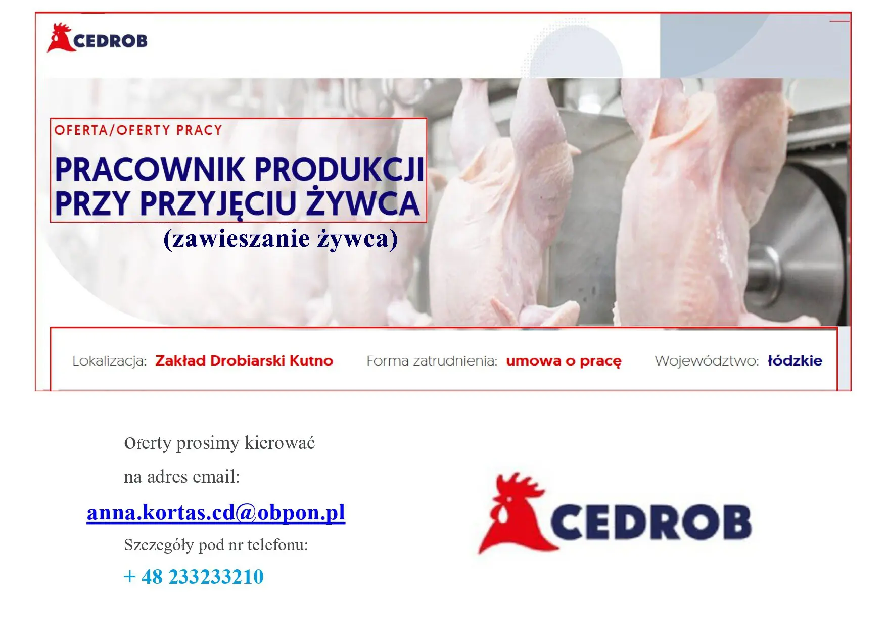 „Wyrażam zgodę na przetwarzanie moich danych osobowych przez CEDROB S.A. z siedzibą w Ujazdówku Ujazdówek 2a, 06-400 Ciechanów, w celu prowadzenia rekrutacji na aplikowane przeze mnie stanowisko”.
