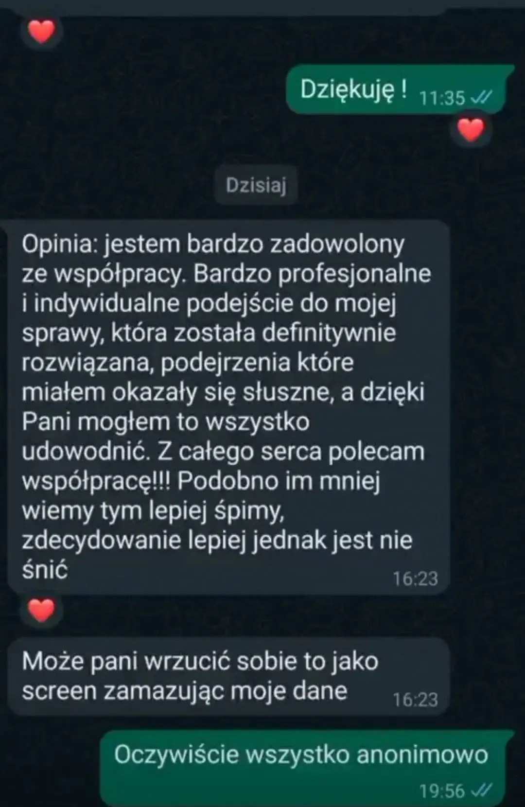 Twoje zlecenie jest w pełni poufne. Dbam o to, aby wszystkie działania były przeprowadzone z największą ostrożnością i w zgodzie z Twoimi oczekiwaniami.
