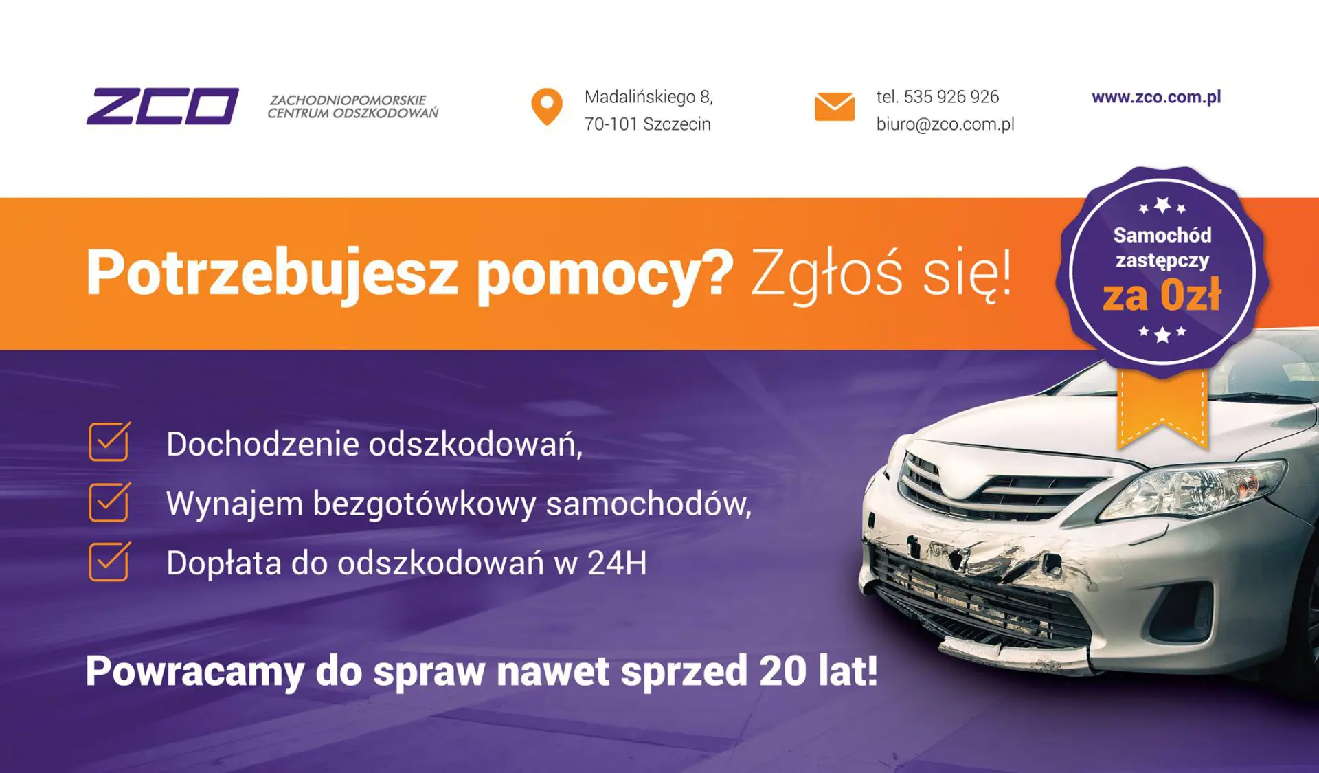 Zachodniopomorskie Centrum Odszkodowań w Szczecinie to firma specjalizująca się w dochodzeniu odszkodowań od firm ubezpieczeniowych i w udzielaniu pomocy prawnej osobom poszkodowanym w wypadkach.